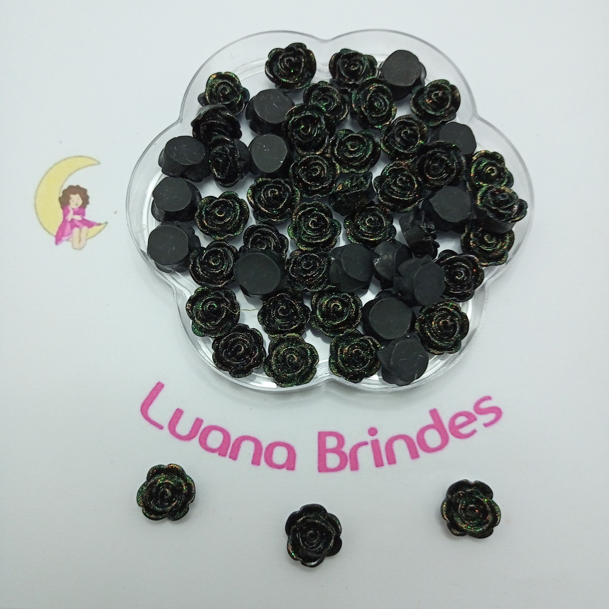 Aplique Flor Preta Glitter Acrílico 1,4cm Pct 20 Unidades | APLIQUES DE ACRÍLICO | Aplique de Flor Preta com glitter em acrílico pacote com 20 unidades tamanho 1,4cm Ideal para artesanatos em geral: você pode usar em lembrançinhas, cadernos artesanais, doces, ... | R$16,00 | |